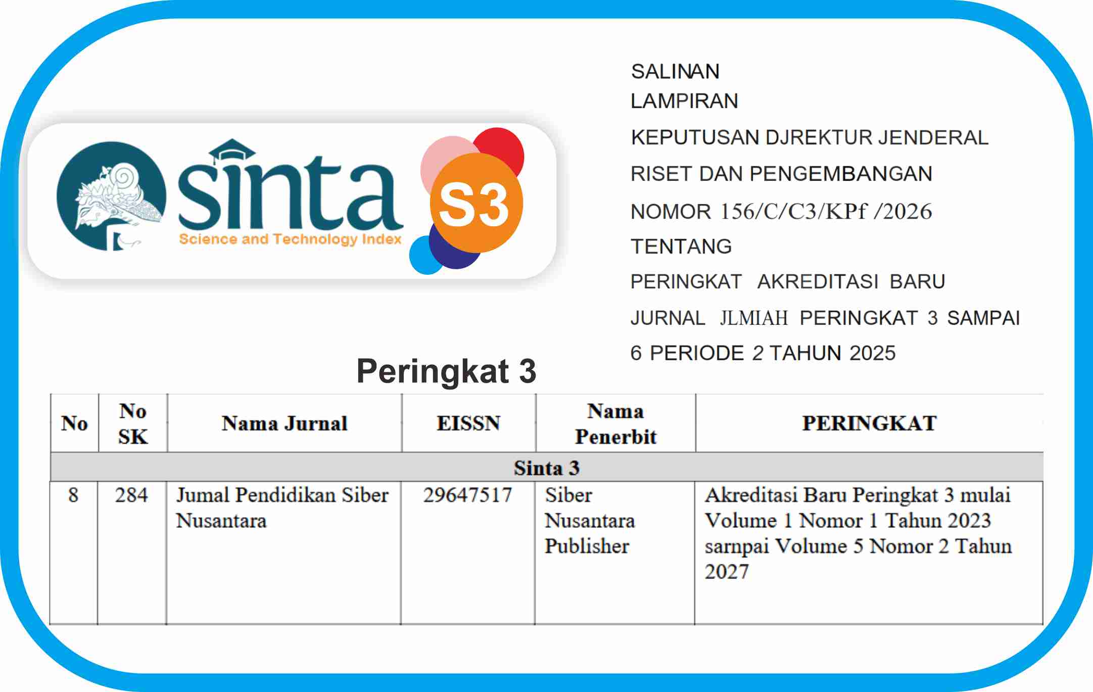 Jurnal Pendidikan Siber Nusantara (JPSN) Volume 1 Nomor 1 Tahun 2023 sarnpai Volume 5 Nomor 2 Tahun 2027 Terakreditasi Sinta Peringkat 3 berdasarkan Nomor Akreditasi: 156/C/C3/KPT/2026, 7 April 2026.